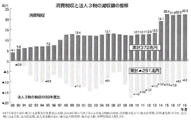 導入の時には、社会保障費に充てると言っていましたが、グラフを見てわかるように、(このグラフも有名になってしまいました)消費税分がそのまま法人税の減収分に充てられているかの様子が分かります。